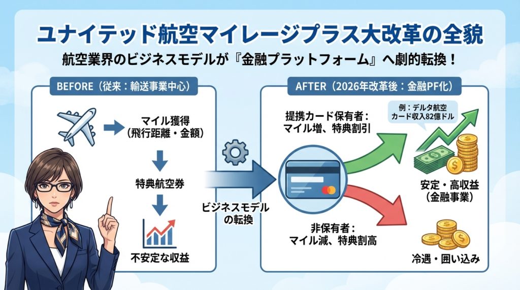 はじめに 飛行機に乗るたびに貯まるマイル。多くの方が利用している「マイレージプログラム」が、今大きな転換期を迎えています。2026年2月、ユナイテッド航空は10年以上で最大規模となる「マイレージプラス」プログラムの改革を発表しました。この変更は4... 未分類
