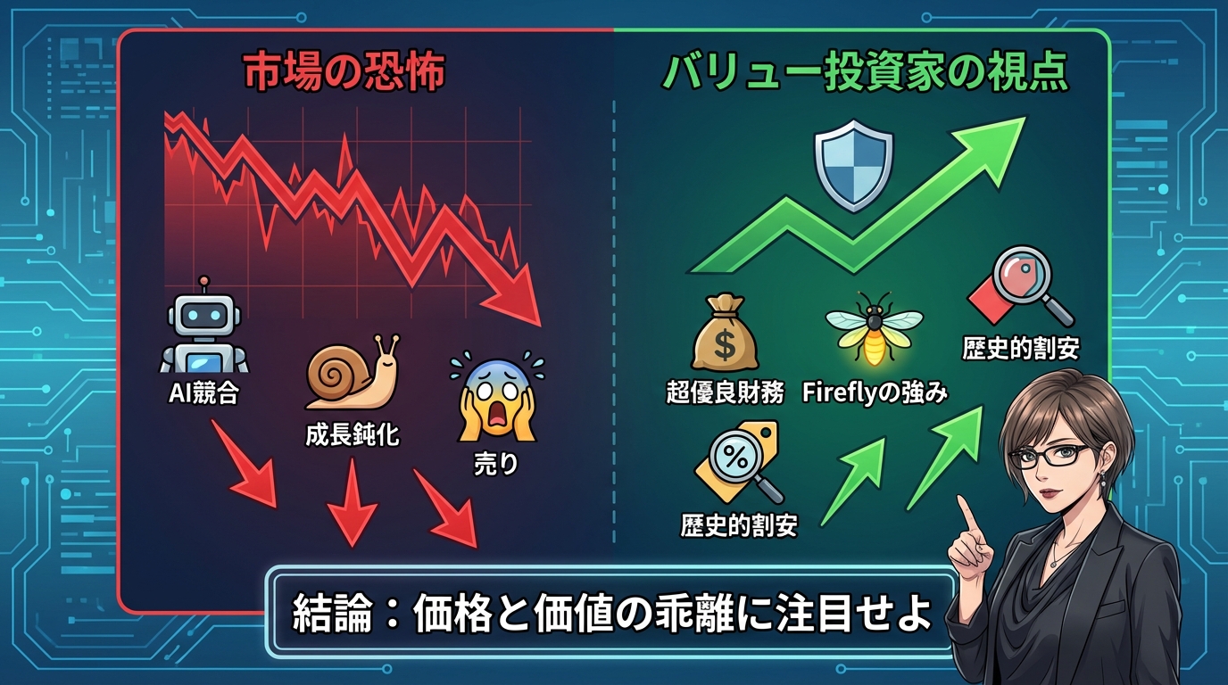 Adobeの場合、ビジネスモデルは健全なのに、AI競争への恐怖から過剰に売られている可能性があります。こうした状況を冷静に見極めることが大切です。