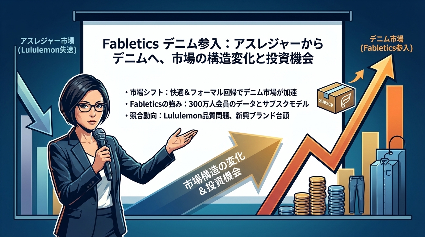 Fableticsのデニム参入は、単なる商品ラインの拡張を超えて、アパレル市場全体の構造的変化を象徴する出来事です。