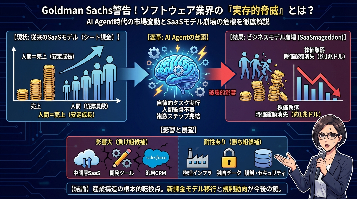 本記事では、Goldman Sachsの警告の真意、AI Agentがもたらす変革の本質、そしてソフトウェア業界が直面している構造的な課題について、わかりやすく解説していきます。この記事を読むことで、今まさに起きている市場の大転換を理解し、テクノロジー業界の今後を見通すヒントが得られるはずです。