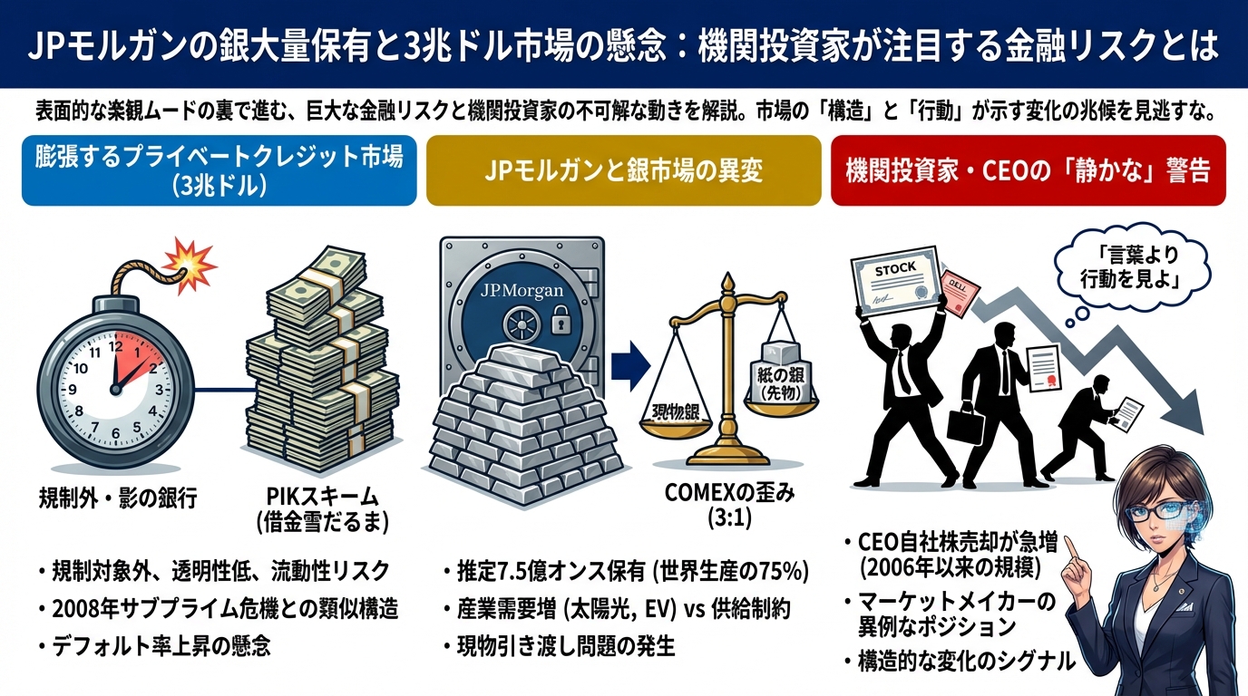 2026年2月現在、ウォール街では水面下で注目すべき現象が進行しています。JPモルガンによる大規模な銀の現物保有、3兆ドル規模にまで膨れ上がった「プライベートクレジット市場」、そして2008年の金融危機前夜を彷彿とさせるCEOたちの自社株売却――。