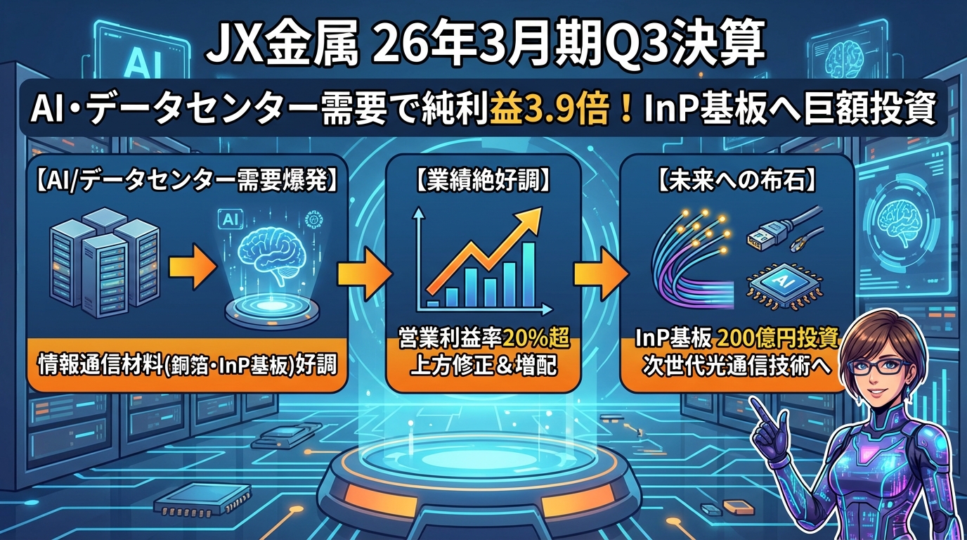 JX金属の2026年3月期第3四半期決算は、単なる一時的な好業績ではなく、同社が長期的な成長の入り口に立っていることを示唆する内容となりました。