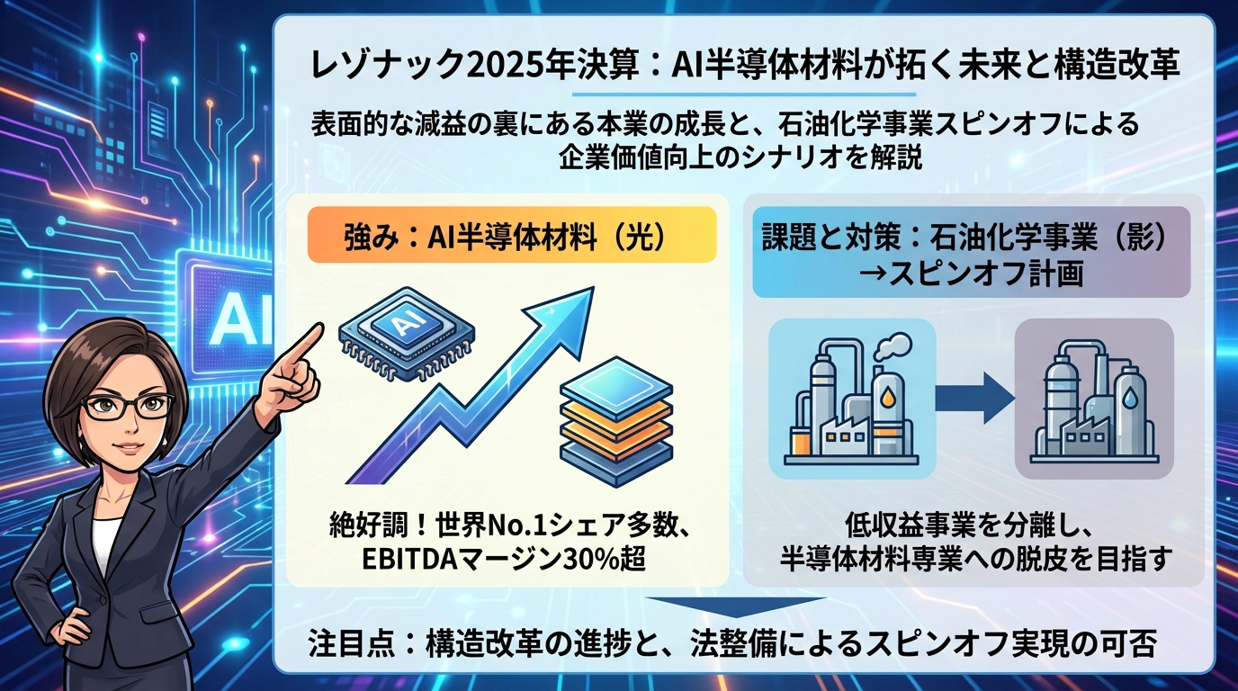 現在のレゾナックは、AI半導体材料という極めて高収益で成長性の高い 「光」 の部分と、石油化学やグラファイトという市況依存型で低収益な 「影」 の部分が同居している状態です。