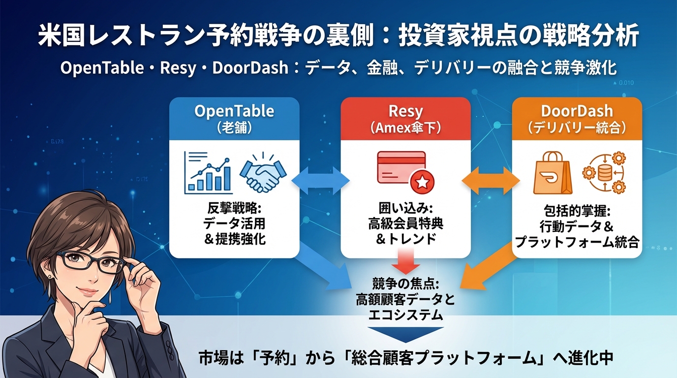 この記事では、OpenTable、Resy、DoorDashという三大プレイヤーがどのような戦略で競い合っているのか、なぜ金融機関が予約サービスに参入してきたのか、そして私たち消費者やレストラン側にどのような影響があるのかを、分かりやすく解説していきます。
