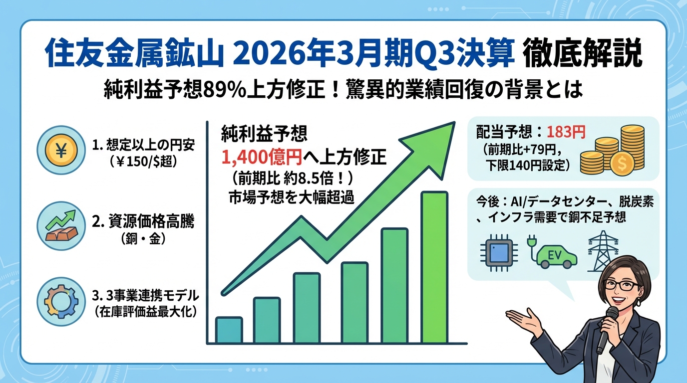 住友金属鉱山の2026年3月期第3四半期決算は、89%という大幅な上方修正と配当増額により、市場に大きなインパクトを与えました。