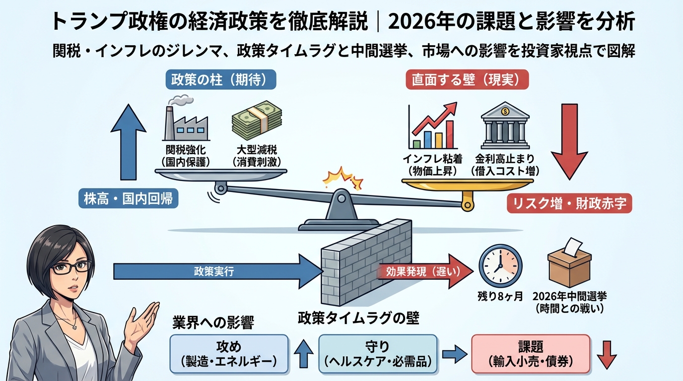 この記事では、トランプ政権が進める主要な経済政策について、その内容から期待される効果、そして直面している課題まで、わかりやすく丁寧に解説していきます。経済政策の「タイムラグ」という重要な視点も交えながら、2026年の中間選挙を控えた今、アメリカ経済がどこに向かおうとしているのかを一緒に見ていきましょう。